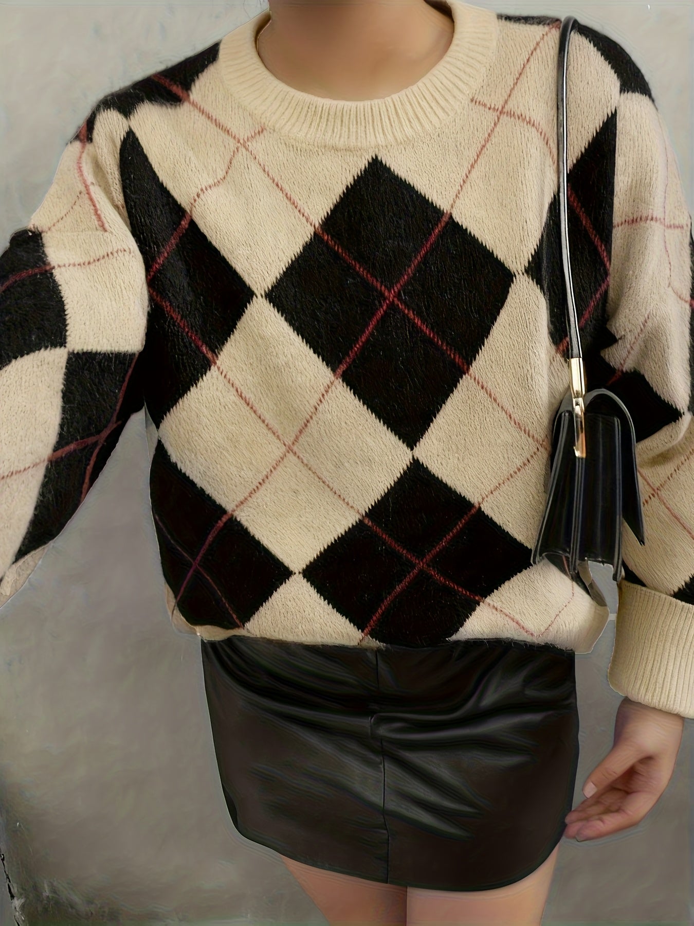 Pull femme élégant à col rond, au style vintage et intemporel. Sa coupe ample et sa maille tricotée à élasticité moyenne offrent un excellent confort tout au long de l’année. Le motif géométrique color block, avec impression positionnée, apporte une touche moderne et raffinée, idéale aussi bien pour un look quotidien que plus habillé.